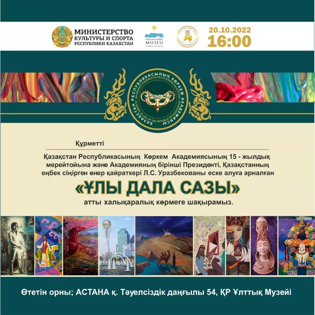 2022 жылдың қазан айының 20—да, ҚР Көркем академиясының 15—жылдық мерейтойына және еліміздің Тәуелсіздік күніңе арналған Ұлттық музейде көрме өтеді. Көрмеге шақырамыз!