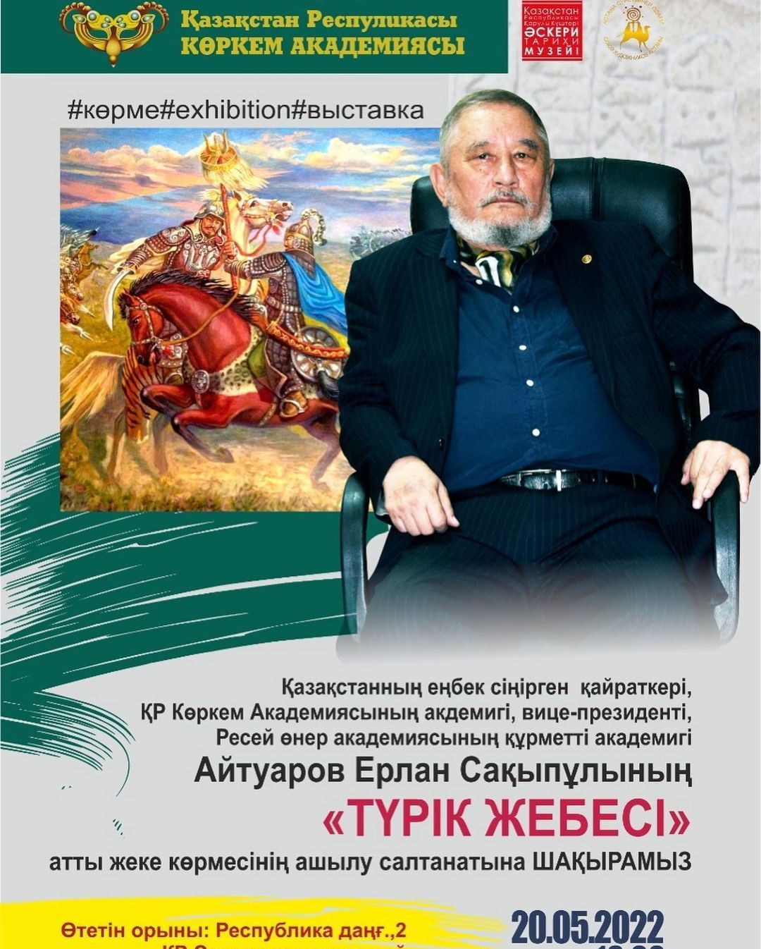 20 мамыр 2022 жылы, ҚР ҚК Мемлекеттік Әскери-тарихи музейінде Көрнекті суретші-монументалист, Қазақстанның еңбек сіңірген қайраткері, ҚР Суретшілер Одағының мүшесі,ҚР Көркем Академиясының академигі, вице-президенті,Ресей Өнер Академиясының құрметті академигі, Айтуаров Ерлан Сақыпұлының "Түрік жебесі" атты жеке көрмесі ашылды.