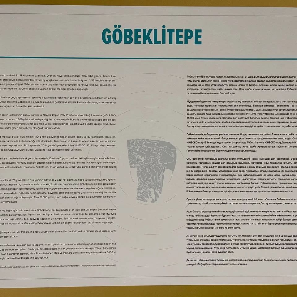 2022 жылы екі бауырлас ел Түркия мен Қазақстанның дипломатиялық байланыс орнатқанына 30 жыл толады. Осы орайда Нұр Сұлтандағы Юнус Эмре атындағы түрік мәдениет орталығы Түркияның Қазақстандағы Елшілігі мен ҚР Ұлттық музейдің қолдауымен 29 қыркүйекте «Тарихтың бастапқы нүктесі: Гөбеклітепе» атты фотокөрме ұйымдастырылды. Гөбеклітепе кешені -Түркияның Шанлыурфа қаласының орталығынан 18 км жерде, Өренжик ауылының маңында орналасқан әлемнің ең көне ғибадат орталығы. Бұл құнды ескерткіштер Мальтадағы ғибадатханадан шамамен 6500, Англиядағы Стоунхенджден 7000 және Мысыр пирамидаларынан 7500 жыл бұрын салынған.