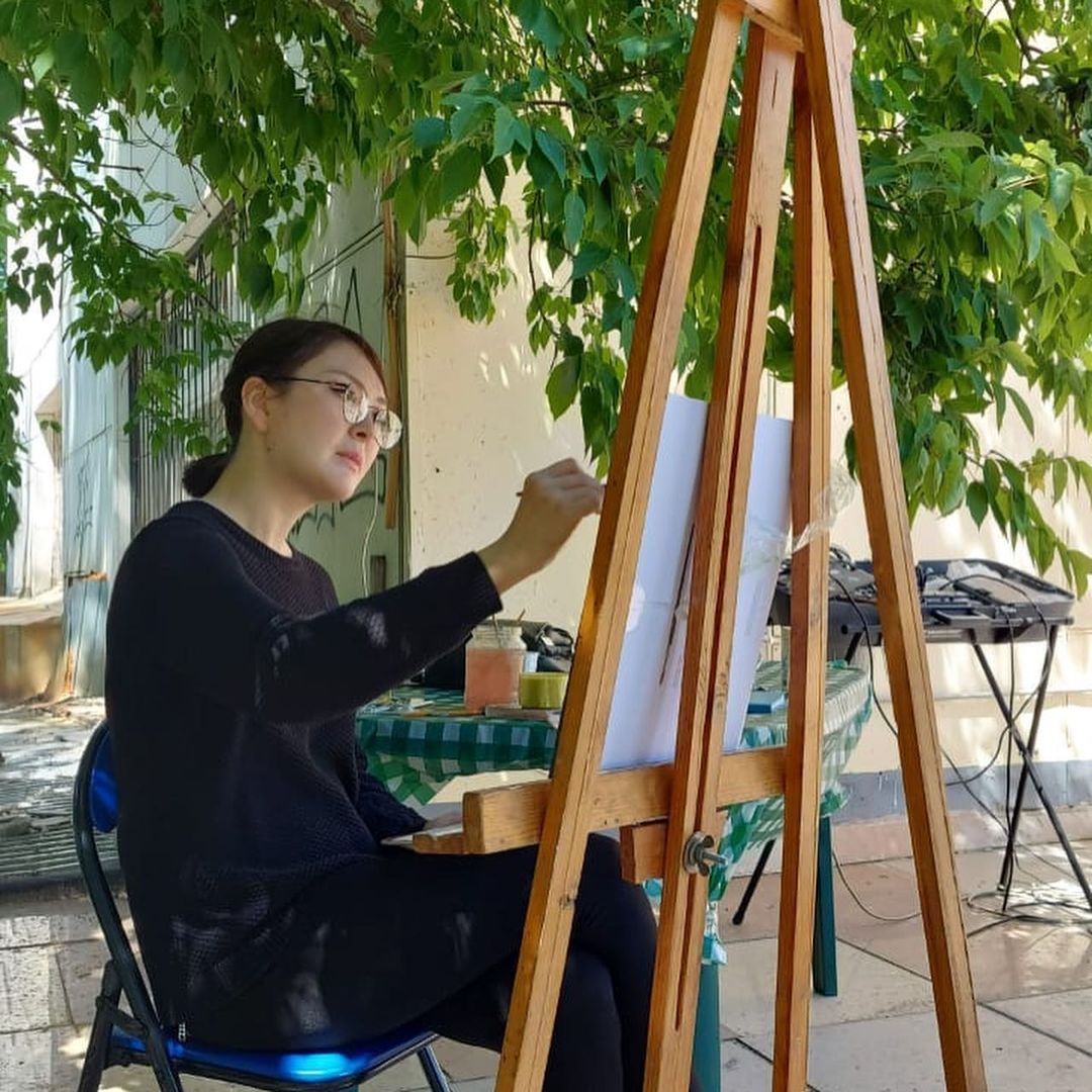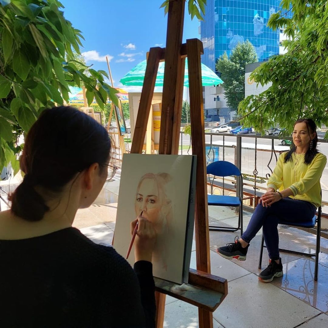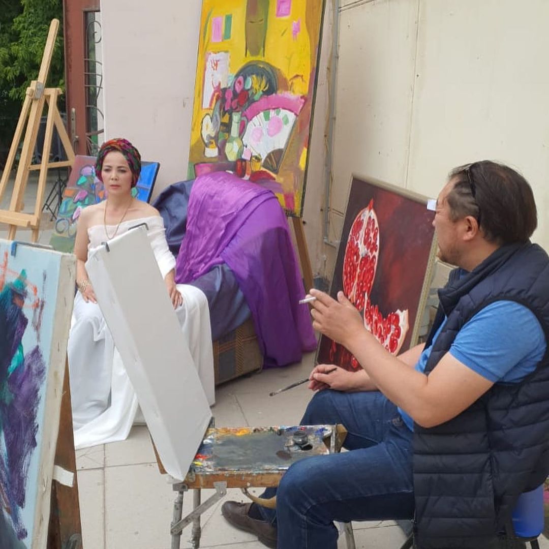 Айдана Минайдарова пишет потрет арт-менеджера Акжан.