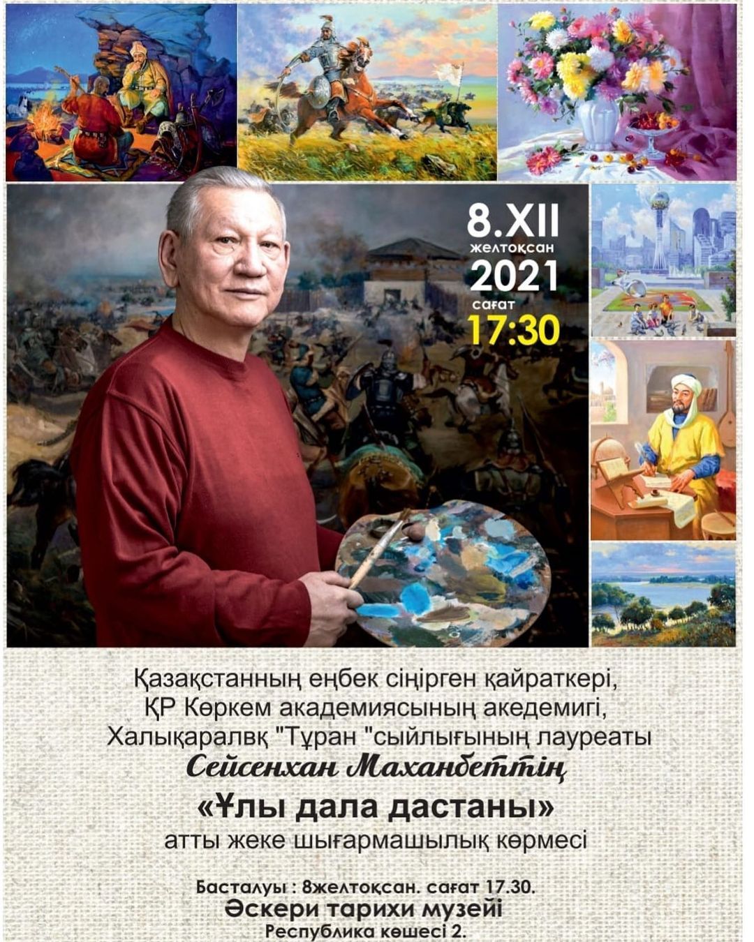 Уважаемые Друзья, Гости и жители г.Нур-Султан!!! Приглашаем Вас на открытие персональной творческой выставки "Ұлы дала дастаны" Сейсенхана Орынбековича Маханбетова. Заслуженного деятеля Республики Казахстан,Академика Академии Художеств Республики Казахстан, Лауреата Международной премии «Туран»,Члена Правления Союза Художников г. Нур-Султан. Место проведения: г.Нур-Султан пр.Республики 2, Военно-исторический музей. Начало:8 декабря 2021 года в 17.30 ч.